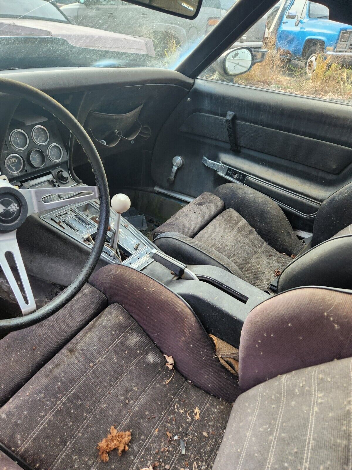 The interior is an interesting study as it is occupied by some very non-original seats. Additionally, it can be seen from the console that this was originally a four-speed manual transmission car – which makes sense considering its claimed born-with powerplant. The interior looks totally grody, one would think that the windows were left down, in a damp environment, for some extended period of time.