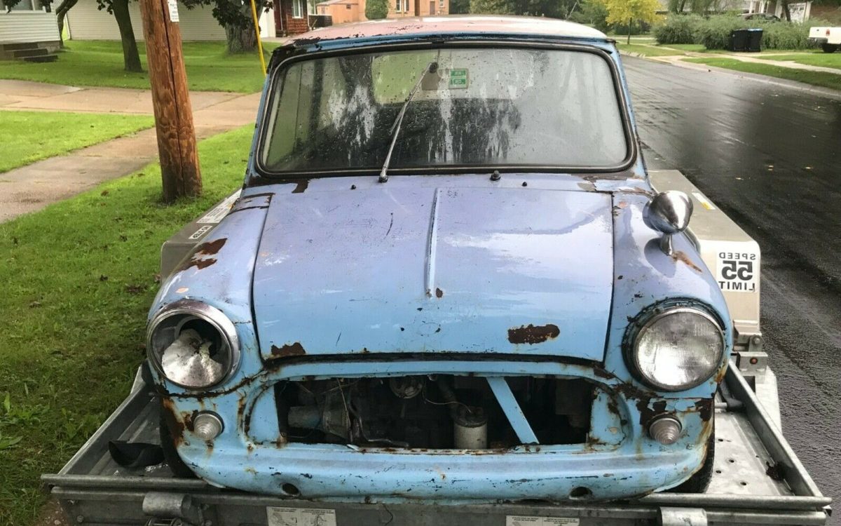 The Mini still wears its British registration plates on the rear, which makes it seem likely that this car was brought to the U.S. years ago, either with a service member or individual who was working overseas for a while. The seller notes he recovered it from a Wisconsin dairy barn, so it clearly hasn’t spent much time as a part of an owner’s prized collection, despite its relative rarity. The faded blue paint is not original, as the car left the factory wearing Old English White/Black with Red/Gold trim. The Mini does retain its original front disc/rear drum brake setup.