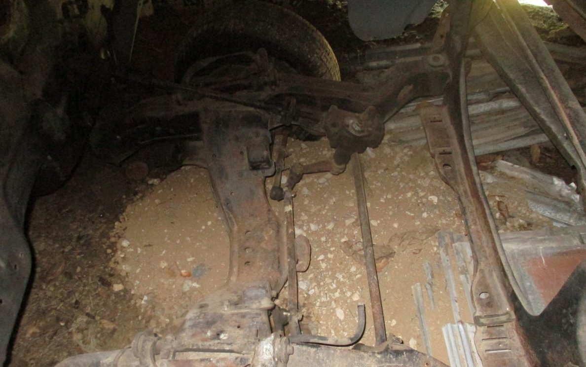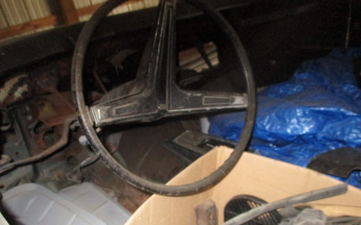 The interior is pretty well gutted and it’s difficult to get a thorough look at what’s going on in there. This is a bucket seat equipped car as there is a center console present – a bench seat was actually standard. The instrument panel has been removed from the dash but the original ’68 Chevrolet steering wheel is still attached. All ’68 Chevy passenger cars (except the Corvette) used the same wheel, the center hub emblem changed to reflect the model. And, the likelihood of finding an uncracked original piece is slim to none – probably the reason that it was a one-year-only item.