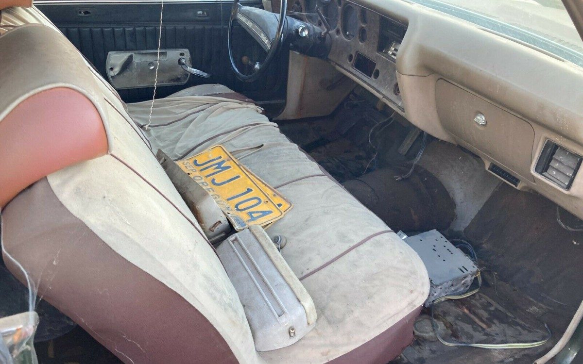 The interior appears to have originally been sandalwood but it’s hard to tell as the bench seat has a cover over it, the driver’s door panel is black and the carpet is missing. The floors are claimed to be solid, so that’s good to know. Note the size of that Delco radio taking up residence on the passenger-side floor. I can tell you from experience that they are as heavy as they look – it’s amazing how that technology has evolved over the last 50 years.