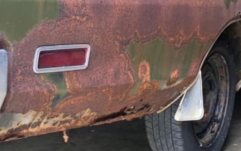 This Coronet is pictured in what appears to be a pine forest and the moss-covered surfaces attest to years in just such a locale ( I must admit, I’ll never understand the logic in ditching an old car in the woods!). The burned horizontal surfaces, however, indicate lots of outside exposure to the hot Georgia sun. Perhaps attributed to both is all of the rust – the seller suggests that the quarters will need to be replaced though the floor pans are supposedly solid. This Coronet appears to have been topped, at one time, with a vinyl roof cover, evidenced by the C pillar stainless trim, as well as the rust-through around the rear window – a common vinyl top induced malady. If the quarters, and the aforementioned roof/rear window area, are the only places that need metalwork attention, I will be very surprised.
