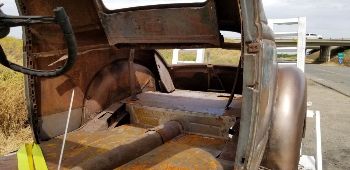 I find it humorous that the seller was so anxious to photograph his soon to be flipped car that he stopped along the side of the highway to take pictures while it was still on the trailer! The pictures are nice and clear though, and we can see some close-ups of the newly fabbed metal floors although they’re already showing some flash rust. No mention is made as to whether a seat frame is included in the sale and it’s probably safe to assume the original wooden one is long gone. Exposure to the hot Arizona sun has taken a toll on the steering wheel and three-quarters of it are all that’s left. Would you replace it with a banjo style wheel instead?