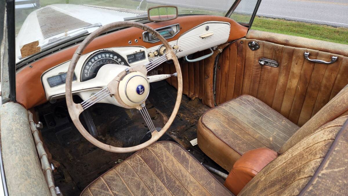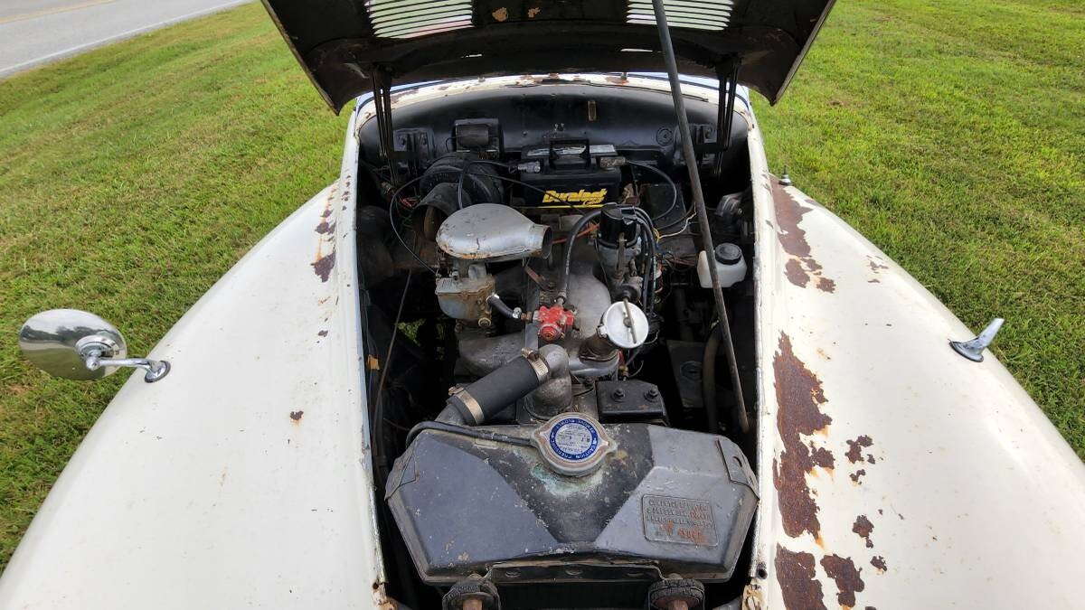 The interior is complete but needs at least some work. It is here that we see the real problem: rusted floors. The seller indicates that the car’s rust is limited and can be repaired “economically”. I never like to see rust though it’s sometimes a necessary evil in return for a low price or a special car. These cars were true roadsters; the side curtains are in the trunk along with a few other miscellaneous parts, but the convertible top is in shreds and will need replacing.