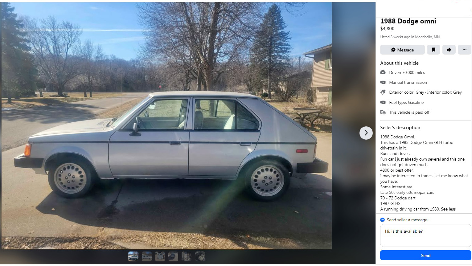 Is there such a thing as too much power? I’m not talking 1,000-hp Bugatti Veyron quad-turbo W16 power, but a 65% bump in horsepower? That sounds just about right to me. This 1988 Dodge Omni has a 1985 GLH-T (turbo) drivetrain transplant, and it’s listed here on Facebook Marketplace in Montecello, Minnesota. The seller is asking $4,800 or best offer, and here is the original listing.