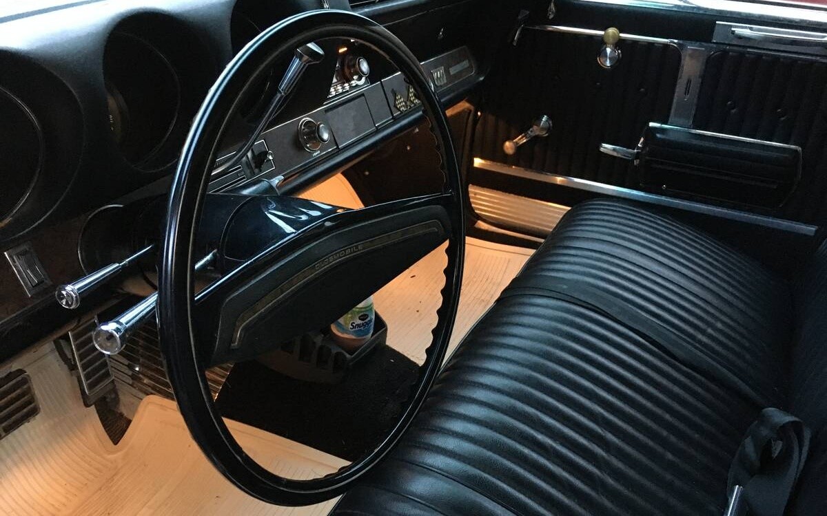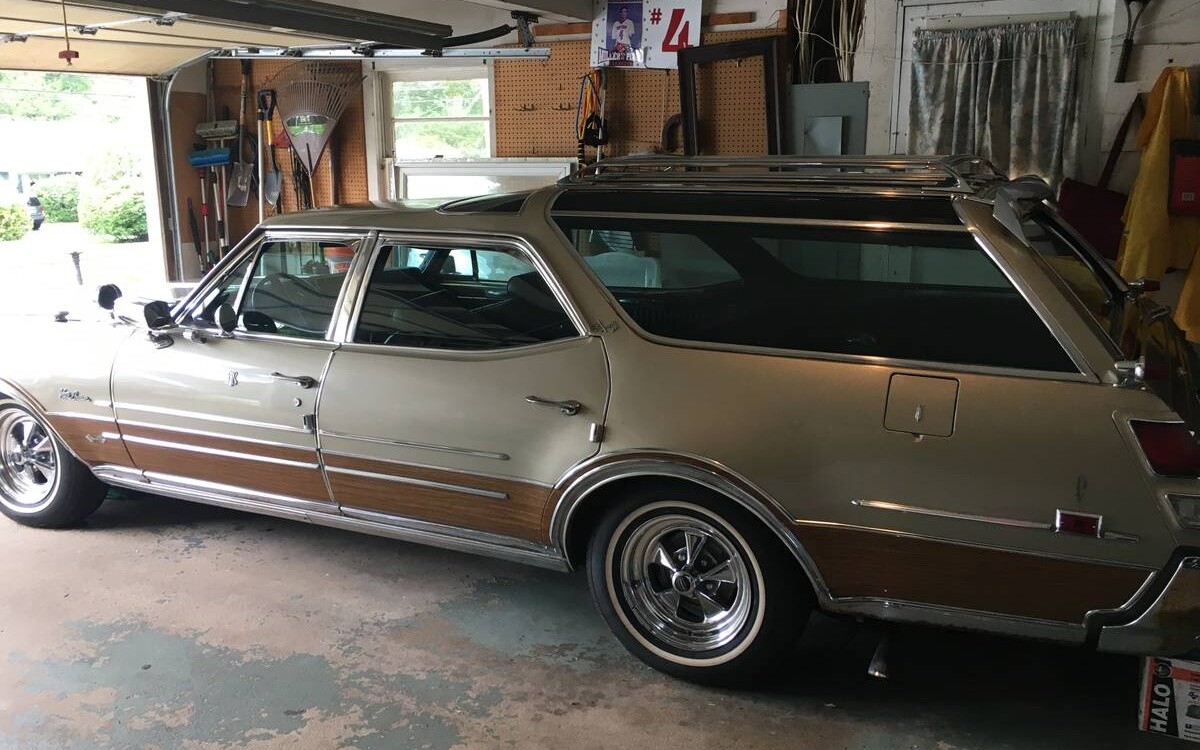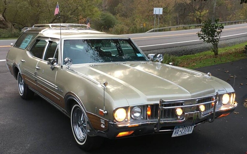 I’ve never seen one where the interior color didn’t match the exterior. Usually too much green. Hopefully most of the “improvements” are adhesive secured. Not a terrible color here, but the black interior would aid the transition to a color change after repairing the unfortunate mounting holes. I can’t say I was ever a woodie fan though I at least admired the craft when they were actually wood. The sticker woodie thing is a bit “stayed too long at the fair” for me. Especially on a vehicle taking subtle futuristic cues from the moon-shot era. Though I could see a light resto-mod done in black w/ faux ebony on the bottom and the Olds rally wheels.