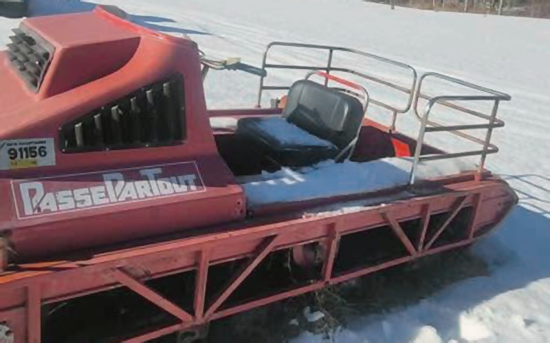 Having tracks and no skis, it wasn’t just a winter vehicle, and the PasseParTout could do almost anything but float. Info on them is a bit sparse, but let me check my showmobile trilogy set of bibles, invaluable information on everything made to pass over or through snow, written by Mr. Pierre Pellerin. There it is in Volume 2, pages 503 and 504! I’m tellin’ ya, if any of you snowmobile history fans don’t have this three-book set, you’re missing out. As I expected, this unusual diagonal-braced frame isn’t shown, and I don’t see it online. Is this custom?