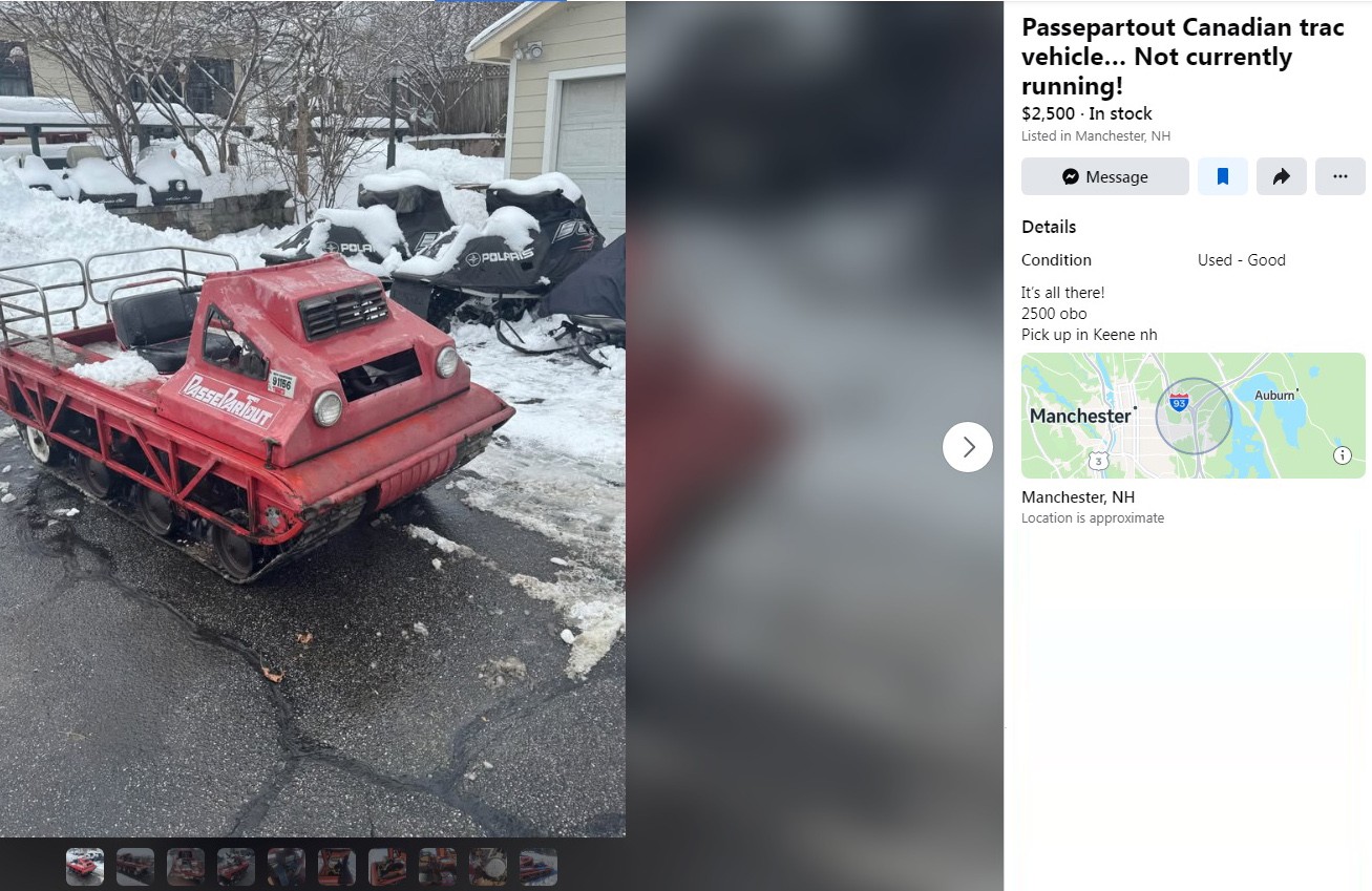 Hey, winter’s over, Gilby! Well, just as you restore your motorcycles in the winter, you restore your snowmobiles, or other snow-related vehicles in the summer. This (currently not running) 1970s PasseParTout Tracked Vehicle can be found listed here on Facebook Marketplace in an incredible area for snowmobiles and snowmobile history: Keene, New Hampshire. The seller is asking $2,500 or best offer, and here is the original listing.