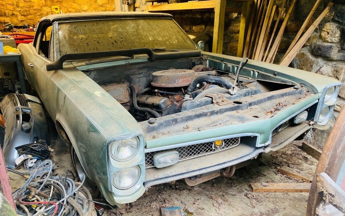 I’d imagine she was quite the looker when it was picked up at Weisz Pontiac in the fall of ’66. It has spent most of its life in Connecticut with a short stint in Illinois. Wearing the Linden Green paint with Rally I wheels, Redline tires, power brakes, steering, rally clock, compass and more, the delivery price was $3,486.08! Well, that new car smell didn’t last long as it was involved in a stinker of an accident as it left the dealership. Ouch! How many times have you heard of this happening? That dented right rear quarter is still there and needs repair. While the topsides/engine bay looks pretty solid, underneath is an unknown after sitting upon a dirt floor for so long.No mention of the hood/trunk lid/bumpers. I hope they’re just sitting off to the side. Again, ask Mr. Richardson…
