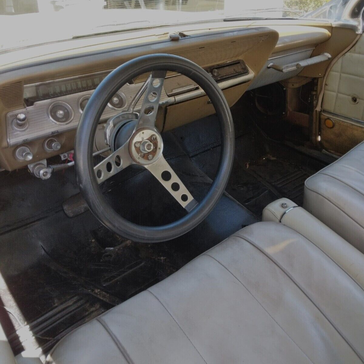 No history is provided about this Chevy other than to say that it’s original when it comes to the body. There is some surface rust in suspect places that may run deeper, and the gold paint has worn down to metal on the roof in a couple of spots. So, you likely could drive this car for an indefinite period before resorting to a full restoration. Besides the racing steering wheel (that’s got to go), everything else looks like 1962 except for under the hood. And maybe this car had the radio-delete option.