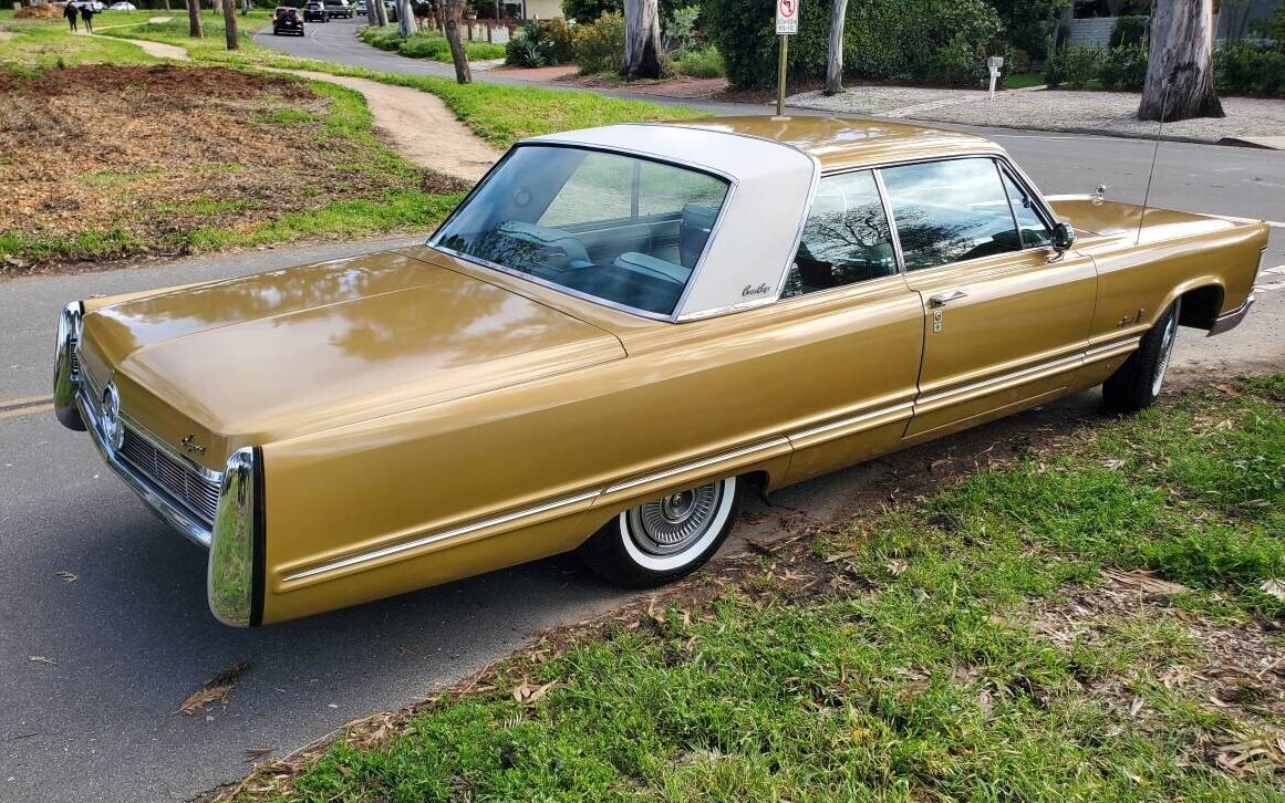 I really like this car, with leather interior, what a classic! The only downfall I see is the color, you would have to repaint the entire car if you had any damage to get it to match. My dad had a gold ’66 Caddy with a small dent in the front fender and the paint looked out of place.