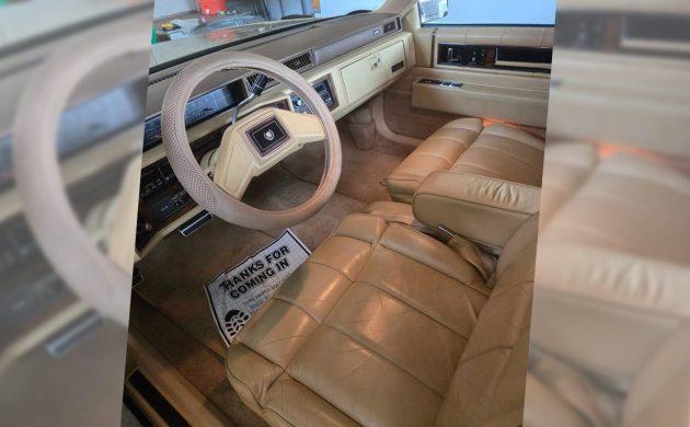 The engine is GM’s infamous HT-4100, a 4.1-liter OHV V8 with 130 horsepower and 200 lb-ft of torque. It’s backed by a four-speed Turbo-Hydramatic sending power to the, gasp, front wheels. They say it’s an excellent running and driving car with working (I’m assuming cold) AC. Any thoughts on the smaller DeVille series?