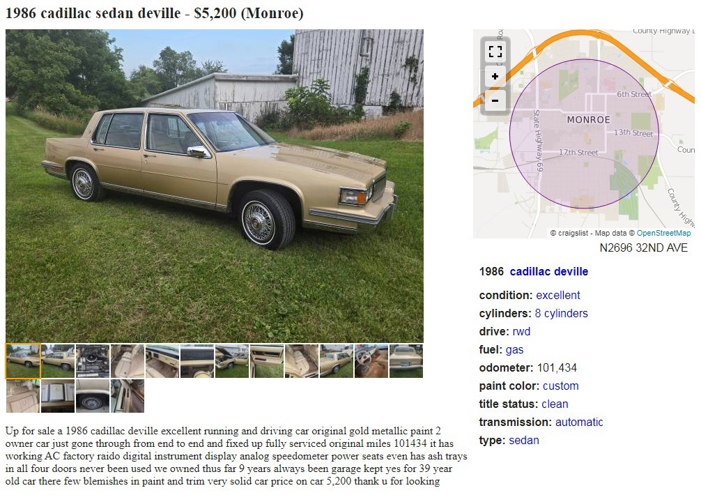 The sixth-generation DeVille series was made from 1985 through 1993, and they were available as a Sedan DeVille, as seen here, and also a Coupe DeVille. Conversion companies made convertibles, and we saw one way back in 1942, or whenever it was. I guess it was 2017, but it seems like much longer ago than that. We don’t get to see inside the trunk or underneath, and the only exterior flaws I see are that the driver’s door is a shade darker and the bumper filler material appears a different shade.