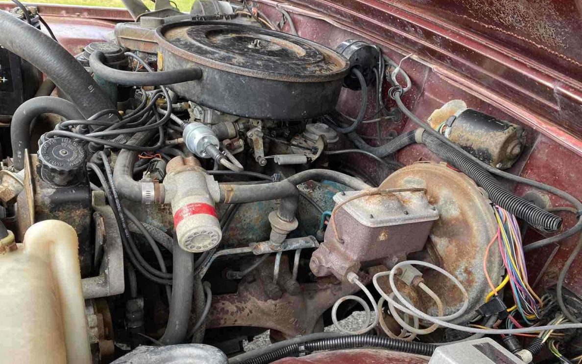 The exterior of this pickup is sporting a bit of gold striping as an accent but it works pretty well with the Bordeaux Metallic exterior finish (what the seller refers to as “red”). And the trim has held up pretty well too as it doesn’t appear to be peeling off or fading away. That’s pretty much the same story for the finish, there is some fading but the presentation, over-all, is solid. The hood eagle is reminiscent of a similar vintage Pontiac Trans Am though this bird is flying in the other direction and appears to have lost a bunch of its feathers. The exterior looks sound with no concerns over obvious rot or damage.