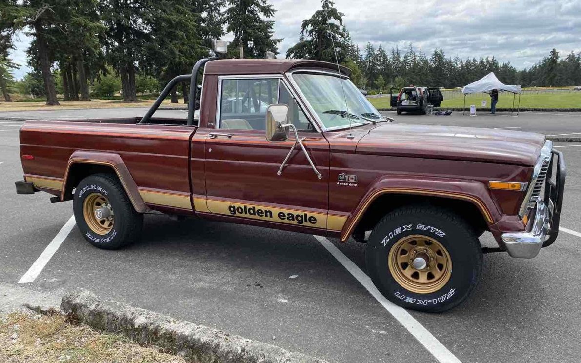 The J series Jeep pickup was produced between 1962 and 1988, being discontinued shortly after Chrysler Corporation’s acquisition of AMC. The prevailing thought was that Chrysler had enough pickup trucks with its Dodge Ram line-up and didn’t want a Jeep competitor. Obviously, that is not today’s prevailing thought. The Golden Eagle package was an available option offered between 1977 and 1983 and included bucket seats, denim panel inserts on the door cards, carpeting, a soft-feel steering wheel cover, an engine-turned instrument cluster trim, Golden Eagle decals and striping, bright door window frames, bed-mounted roll bar, brush guard, off-road auxiliary lights, 15″x8″ gold-painted steel wheels, white lettered tires, and hood insulation.