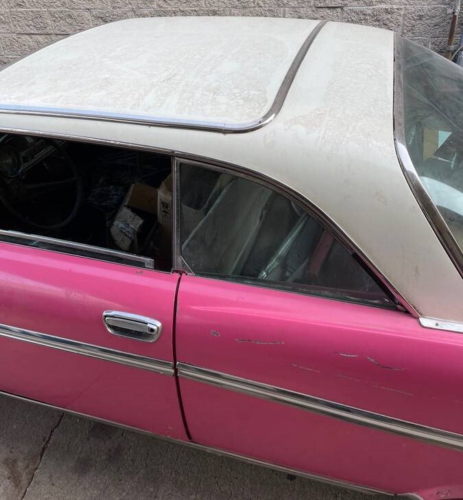 This Saratoga comes across as a work-in-progress, situated in a cramped alley that makes taking photos difficult. The body looks to be in good condition, perhaps escaping the rust blight that often afflicted these cars. But the white over pink paint doesn’t look like the Ivory White over Persian Pink that was a factory two-tone option. The pink on this car is deeper and looks more like it came from a bottle of Pepto-Bismol.
