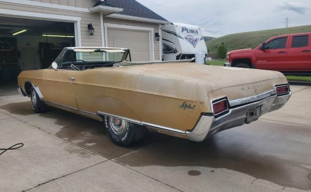 What a great design, and I’m a big fan of rear fender skirts, just for the record. Even on sporty cars such as this Skylark Convertible. I can do without the white letter tires, but that’s just me. This color is called Gold Mist, and it has a nice, soft look to it, but I think it would look much better if it were repainted. There’s a bit of rust repair to do, as the bottoms of the doors and other edges and bits show some rust.