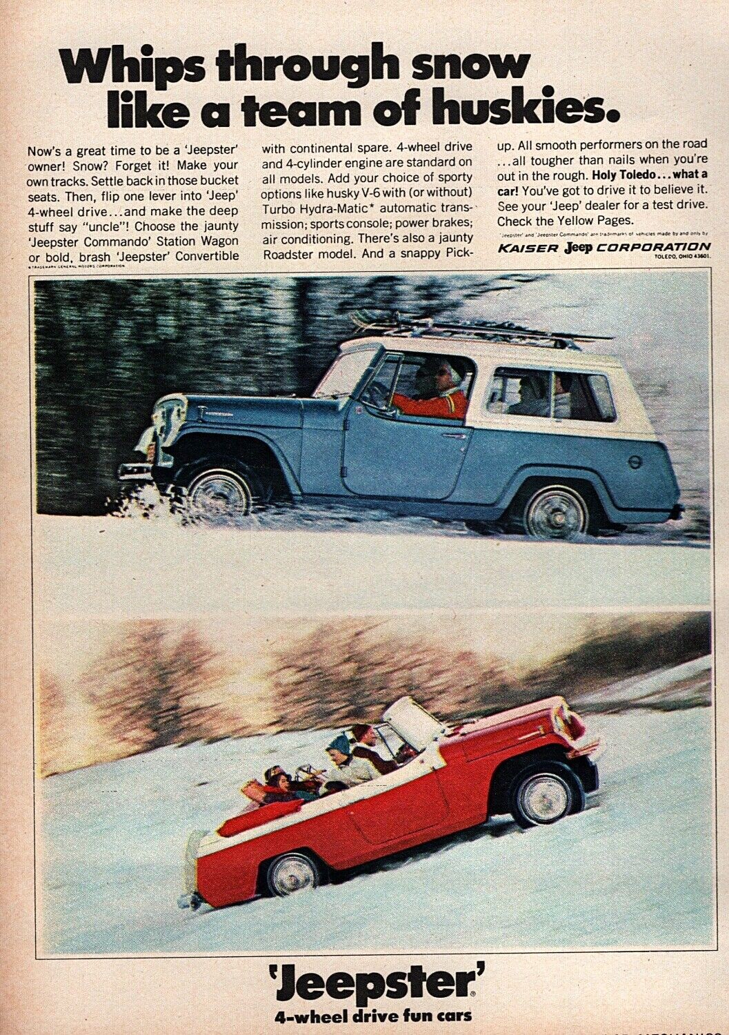Let’s look at the history. The original Willys-Overland Jeepster came out in 1948, and stayed around through 1950. It was snazzy-looking for the period, and for $1,765 it came well equipped with whitewalls, deluxe hubcaps, sun visors, and a continental kit. But the pricing was similar to a Ford Super Deluxe Coupe, which had roll-up windows and a V-8. The Jeepster was offered only with rear-wheel drive. The 1966 to 1973 Jeepsters came with a continental kit, just like the original. The Commando got a spare mounted inside the vehicle, and a simpler bumper design. The Jeepster had the same 101-inch wheelbase as the CJ-6, on which it’s based. The example below is a model, but it gives a sense of the lifestyle usage.
