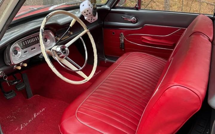 This is the first Falcon based Ranchero I’ve ever seen with Fender skirts. For some reason I like. If you were to ask me before seeing this, I’d say no way. I agree with Bob above, maybe lose some of the extra accessories ( but keep the skirts) paint the steering wheel the appropriate ivory color and a window crank handle and you’re good to go.