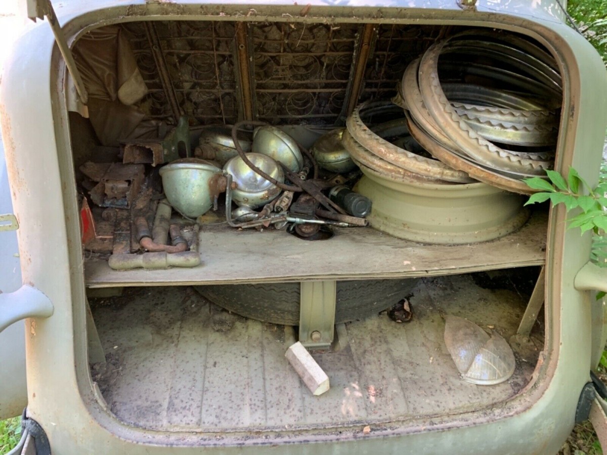 There is more good news in the trunk. From trim rings to a bevy of spotlights, there are a number of spare parts to be refurbished and used. The sad news is that the missing headlight we saw in the first picture has turned up in the trunk. Too bad it is in two pieces.