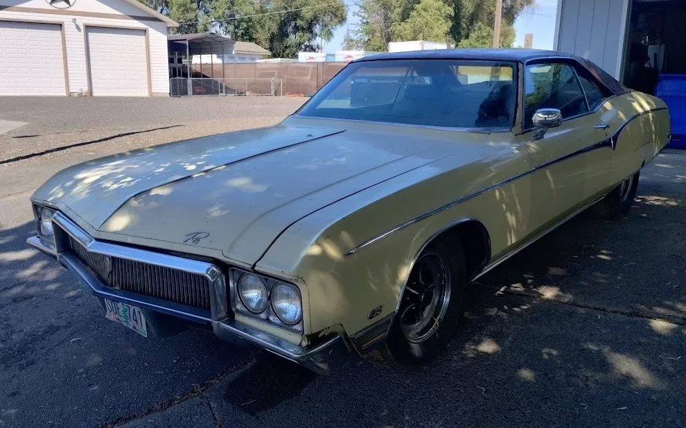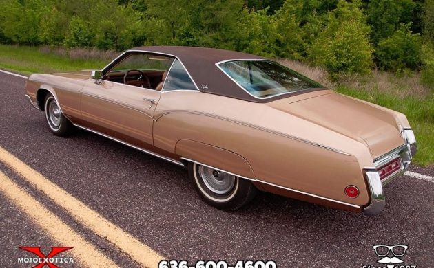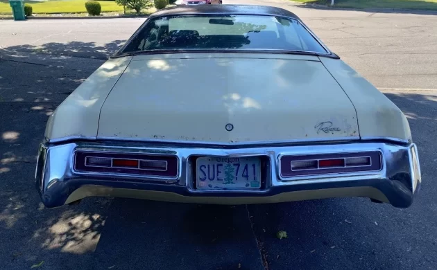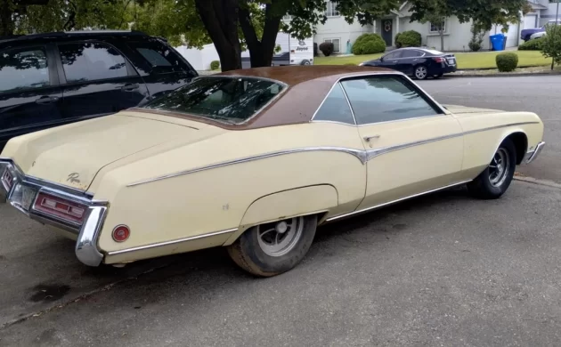 Riviera was available in standard and GS trim in ’70, and 37K buyers, who didn’t have the fender skirt phobia that possesses me, stepped up to the plate and bought one. There weren’t many differences between the GS and the less gran standard model, those differences primarily being mechanical, and consisting of a heavy-duty suspension, a limited-slip differential, and a steeper final drive ratio. The seller tells us that this Riv has been sitting since ’97 and adds, “This car needs quite a bit of love. I am not going to sugarcoat anything. The body is pretty rust-free; however, where the original vinyl top was will need some attention in the trim areas. There is also a little bit under the trunk lid, and where the battery tray is. There is a small amount where and old battery tray meet the inner fender and core support. There is nothing to worry about structure-wise. The driver’s side wheel skirt has an area of rust as well. This car will need new front glass as the area I mentioned where top needs attention around the A-pillars.” That vinyl top looks like it has taken flight, and the underlying steel has either been painted brown, or the vinyl material itself has been coated with something – it definitely doesn’t look right. The side-spear stainless trim, a ’70 only design, is supposed to be color coded to match the exterior, but the coded part has either faded away or been rubbed off. The finish, Bamboo Creme, code 50, according to the getting-ready-to-fall-off trim tag, is worn, and Buick’s ordering guide states that the Bamboo Creme hue was supposedly not available on a Riviera – sounds like some internal miscommunication may have happened. The ubiquitous Buick Road wheels are always a nice inclusion, but I’d suggest that white strip tires would be more typical and in order.