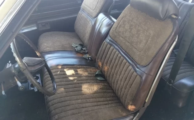 The interior’s brown cloth and vinyl upholstery is in fair shape, though the dash pad is badly split and the headliner is gravity-bound in places. The instrument panel has the usual delamination going on, and the dash, maybe the glove box lid, seems to have problems – the interior images aren’t that clear.