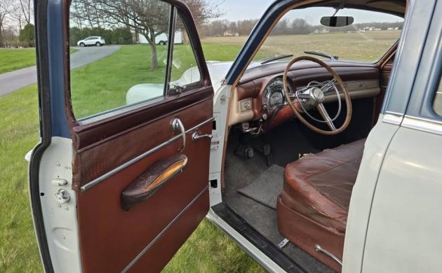 Now in its third year of production, Chrysler’s “Hemi” engine, in this case a 180 gross HP, 331 CI V8, is powering this family hauler. The seller adds, “Good running car, just had a tune-up. Brakes just gone through,” though I’m not sure what “gone through” means in reference to the brakes – does it mean inspected, adjusted, parts replacement, etc.? According to 1953 Chrysler marketing material, two transmissions were offered that year on New Yorker models, the new for ’53 “Fluid Torque Drive” and the “Fluid-Matic” – AKA “Fluid Drive.” The seller adds, “Has a clutch pedal for anytime the transmission is shifted between reverse, power, or driving.”