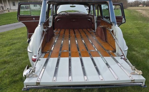 In ’53, the Town & Country station wagon was available on both the New Yorker trim level (1,399 units) or the lower echelon Windsor Standard (1,242 units) – either way, a low production model and one likely not found too often today. As for that missing exterior woodwork, Chrysler kept up the show inside, where the back of the folding rear seat and the cargo floor are paneled in a medium-hued wood with panels held together with stainless steel strips – impressive-looking! Beyond that, the seats appear to be upholstered in leather, and they’re passable but typically worn-looking after 72 years of existence.