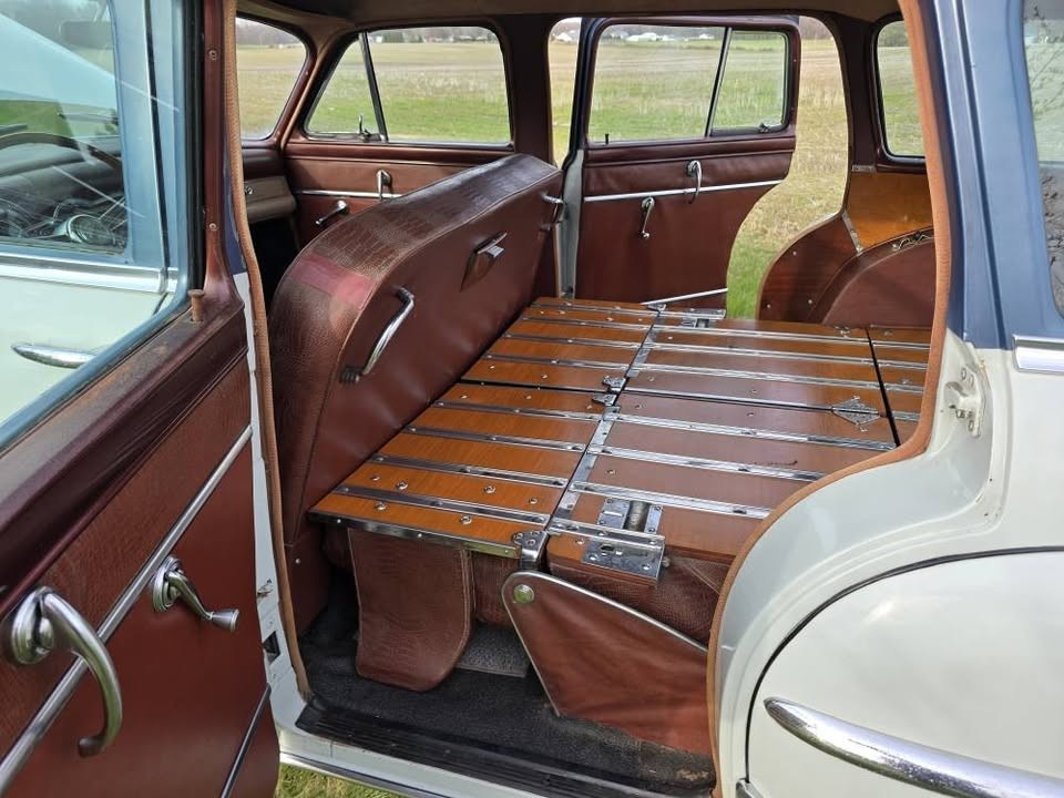 In ’53, the Town & Country station wagon was available on both the New Yorker trim level (1,399 units) or the lower echelon Windsor Standard (1,242 units) – either way, a low production model and one likely not found too often today. As for that missing exterior woodwork, Chrysler kept up the show inside, where the back of the folding rear seat and the cargo floor are paneled in a medium-hued wood with panels held together with stainless steel strips – impressive-looking! Beyond that, the seats appear to be upholstered in leather, and they’re passable but typically worn-looking after 72 years of existence.
