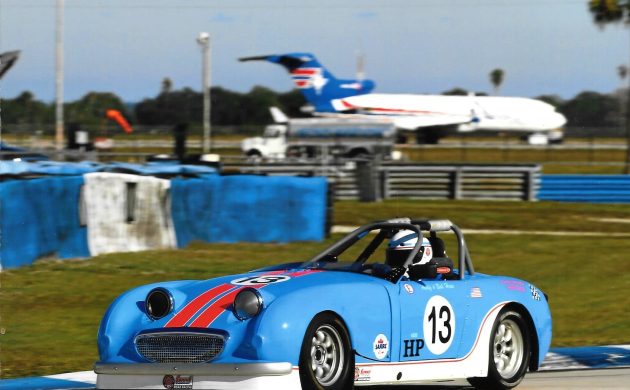 Car is a ’59 Bugeye Sprite H Production SCCA road racing car with full race suspension and brakes, 948cc 100 hp 9500 rpm engine, Ford T-4 straight cut gear transmission, 4:55 positraction rear gears. It’s good for about 136 mph. With driver in it weight is around 1,550 lbs. It’s an absolute kick to drive. If the driver lost a few pounds it would go faster. BTW, 13 has been the car number since 1974.