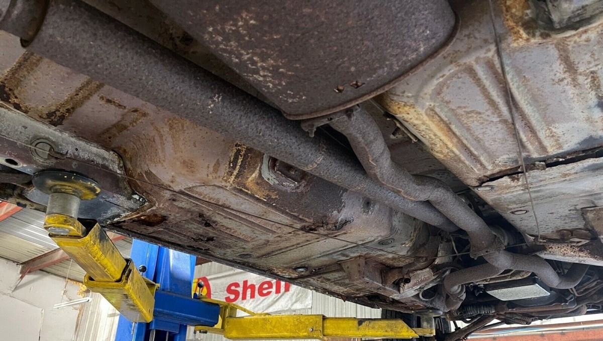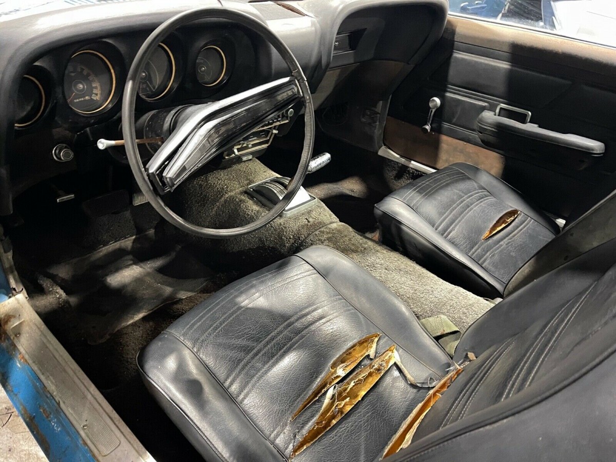 While the Grabber Blue paint job still has some shine, it’s going to need to be refinished once issues with the sheet metal are dealt with. There are hints of corrosion wanting to bust through in a few places (like the rear quarters, which may have already been patched), but the photos on a lift show an undercarriage that hasn’t been rocked with rust. The interior is far from a basket case, but the bucket seats will need to be recovered, the carpeting replaced, and a new dash pad installed unless the one large crack isn’t bothersome.