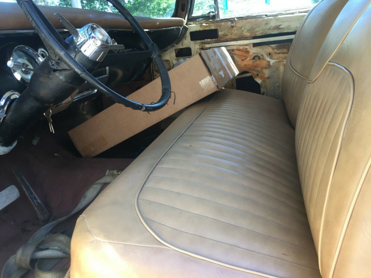 The big 331 motor runs, but only off a can of gas is used, so perhaps work is needed with the fuel lines or gas tank. You can check that out from this video that the seller has provided. For now, this car is just a roller, as the brakes aren’t good either, but the parking brake will hold it in place. The tires are ancient but will hold air and the wheels sport later Cadillac wheel covers, but three originals are in the trunk.
