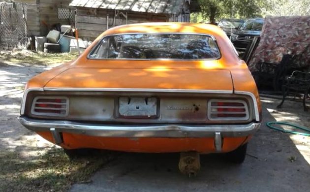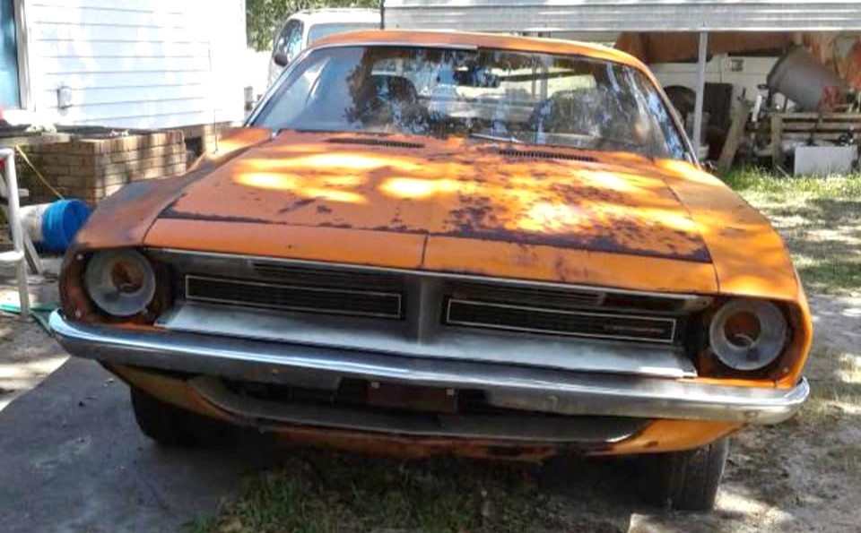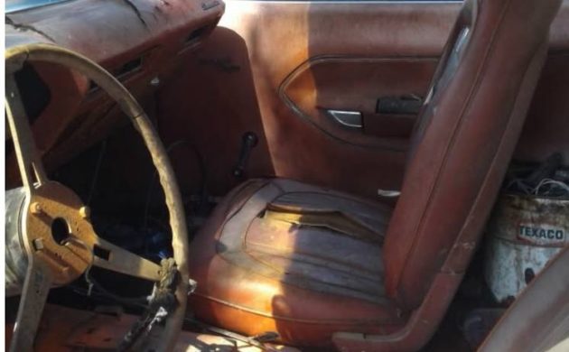 This numbers-matching Barracuda needs restoring. It could be wearing original Vitamin C Orange, which wasn’t as vibrant as the Hi-Impact alternative, Hemi Orange. The leather interior is brown in color and may need a complete makeover (limited photos). While the trunk pan is said to be decent, the passenger floors are “weak” and should probably be replaced. The passenger side front fender is dented, so it should go as well.