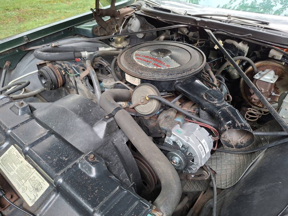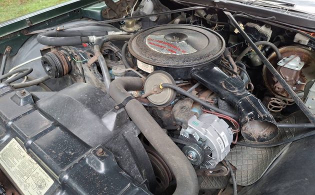 Although 1974 is a model year that few would call “the best,” Ninety-Eight Regency buyers still got a standard “Rocket 455” and Turbo Hydra-Matic transmission (this was the most luxurious Oldsmobile sedan you could buy, after all). As almost all engines were in 1974, however, it had been detuned for emissions, and that resulted in just 210 horsepower, albeit with a healthy torque rating of 350 lb.-ft. The missing belt for the air conditioning compressor tells the tale you didn’t want to hear, but it appears that the alternator has recently been replaced.