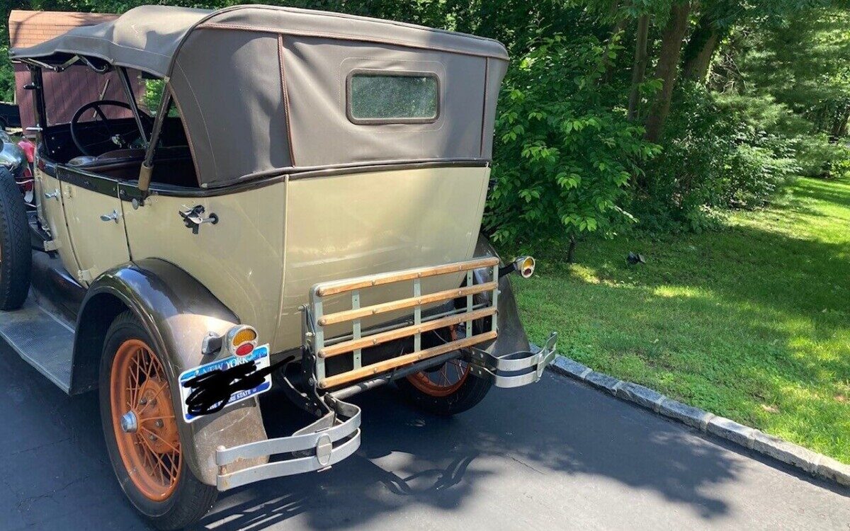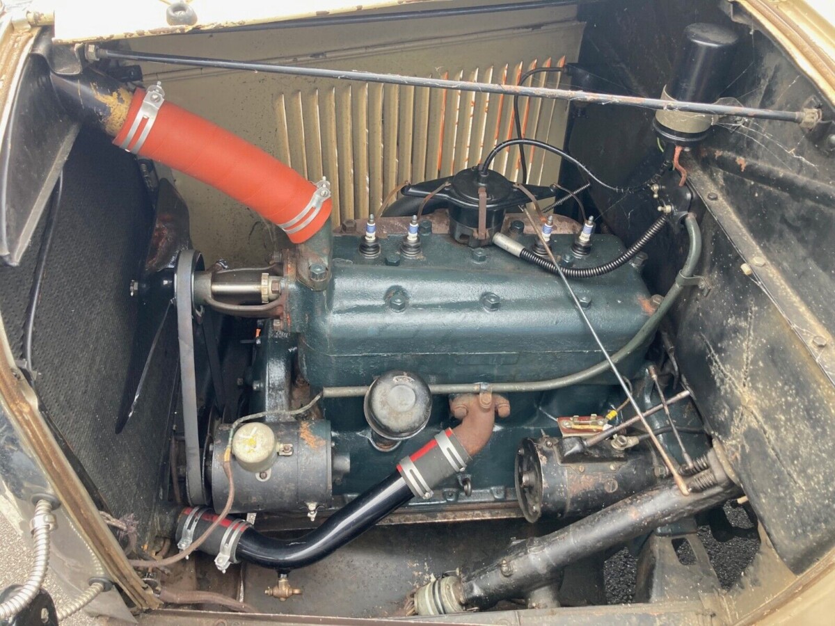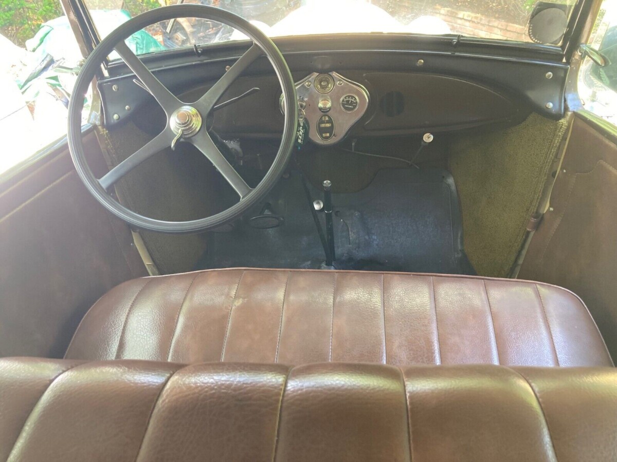 In late 1928, the red resin steering wheel gave way to hard black rubber. The dash of an early 1928 will have an “on/off” indication on the ignition switch which by 1929 had disappeared. Research shows that the interior color had shifted to blue/gray by 1929 but the reality is, most of these cars have been changed substantially from new. This interior is quite spiffy, with no apparent critical needs. The seller does note that a “top support beam” needs repair, but I can’t find the problem in the photos.