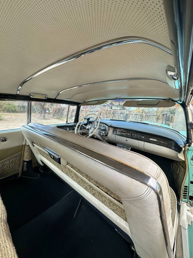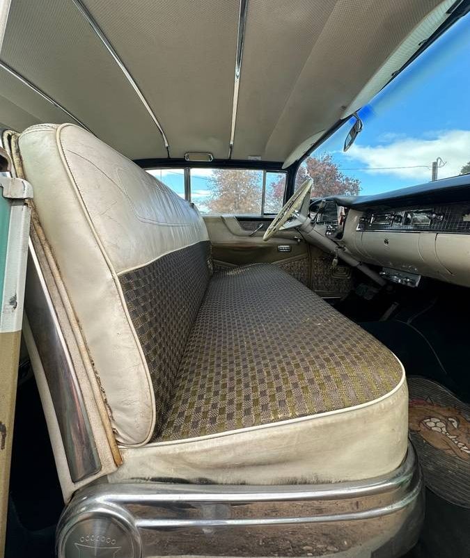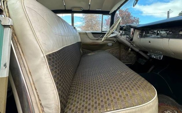 “The interior furnishing of the Sedan de Ville incorporate all the styling artistry that characterizes the name “de Ville,” gushes the ’56 Cadillac high-style sales brochure. They also brag that the “bright and brushed chrome metalwork, roof bows, and door and seat moldings add a special accent of brightness and drama.” I’m impressed with that copywriting as well as the condition of this Caddy’s original interior. The white leather and textured fabric that adorn the seats and door panels looks to be in good condition and oozes mid-50’s style and fashion. (Photos are limited, but there could be some wear on the driver’s seat.) The padded dash looks good as well with no splits or warps. There’s a blanket on the back seat that may or may not be covering up some seat damage, but I’m guessing the rear seat is okay.