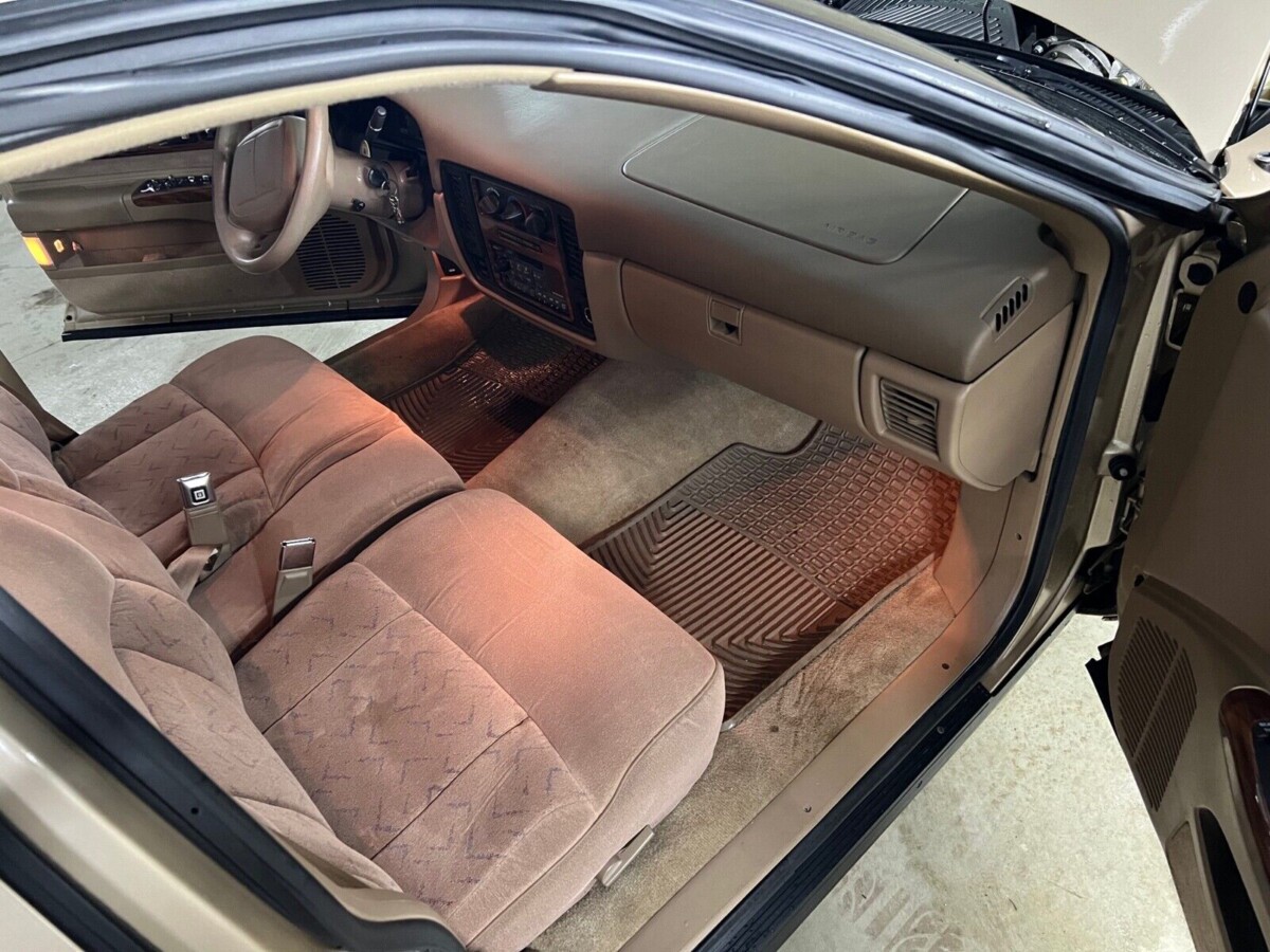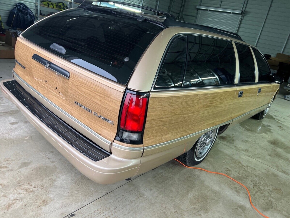 This has classic full-sized station wagon written all over it: big (217.3″ long), roomy, comfy, with acres of faux wood grain vinyl on the sides and dressy wire wheel covers. Its overall condition leads one to believe it has spent a lot of time in a garage and out of the harsh elements the past 28 years. Based on a color chart I found online, it’s painted in Light Driftwood Metallic, an appropriate name and color for such an All-American wagon. I can’t spot any major issues on the exterior of this time capsule. The paint, faux wood trim, and glass (which is tinted) all look very good. The seller states there are “bumps on the bumper, a scratch on the rear pillar, and the rear passenger window tint has a scratch in it.” The underneath is clean with typical surface rust and the spare tire well has a patch on it which the seller (who has owned 10 of these Caprice Wagons) says is typical for these cars.