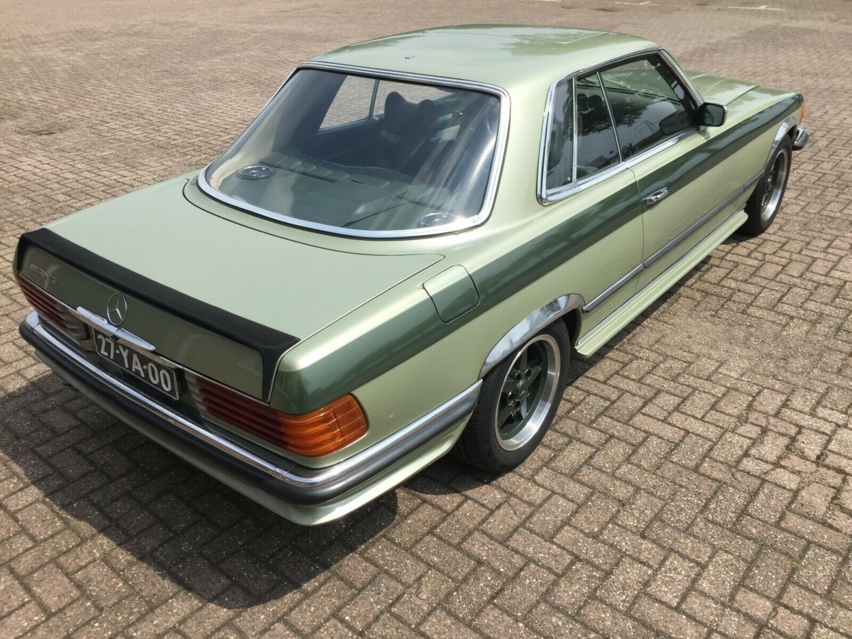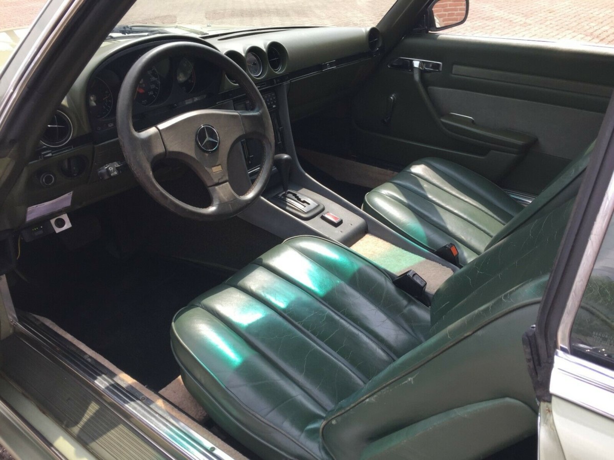 The first thing you notice about this specimen is the AMG bodykit, which consisted of the side skirts, front air dam, and rear bumper skirt. A period-correct rear spoiler adorns the trunk, and 16 inch Ronal alloy wheels wearing color-matched green paint give the exaggerated pinstriping a reason to be there. The SLC designation indicates that this is a hardtop coupe, as opposed to a convertible wearing an optional hardtop. Obviously, the Mercedes wears other obvious clues as to its European market origins, including Euro-spec lighting, bumpers, and license plates.