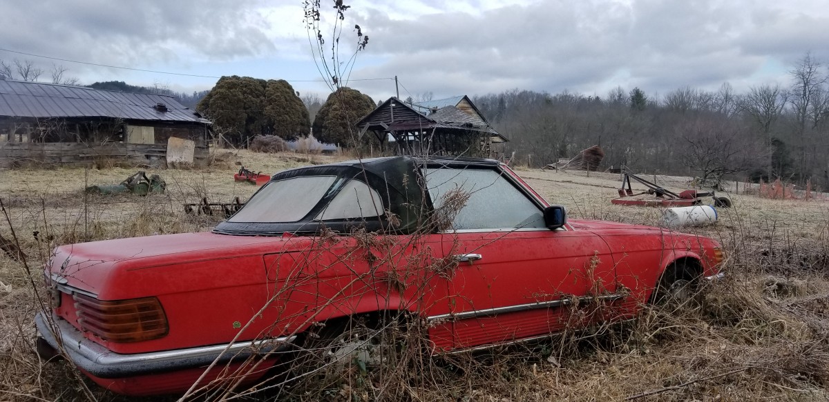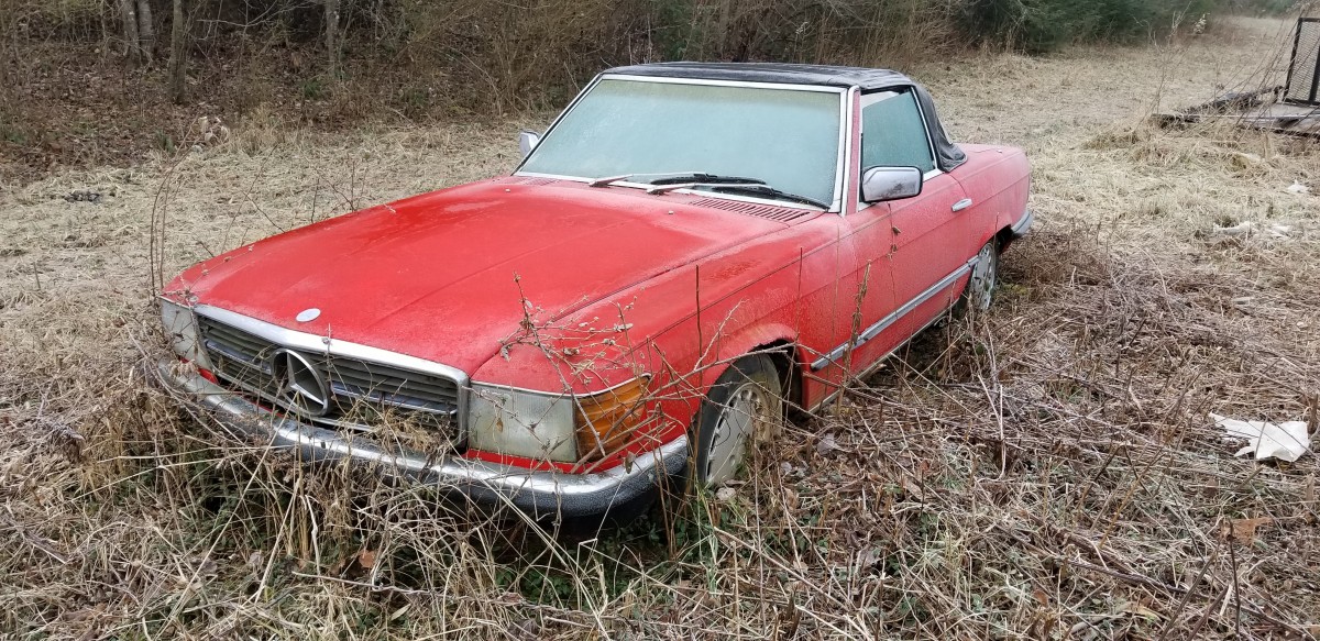I found a red 560SL in pretty much the same predicament (but in Canada, so it was rusty too). The paint was faded to pink, the interior was mouldy and it was full of mice.