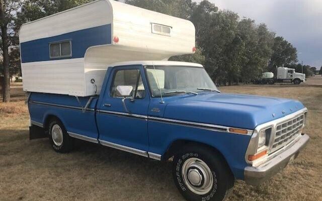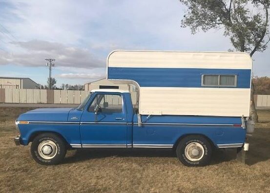I can’t figure out why this great combination truck/camper hasn’t already sold. Lucky for us we still have a crack at it, despite the seller listing it six days ago. Here on craigslist is a 1979 Ford F250 Camper Special with a nifty camper that’s been attached to it from new, for $8,900. The vehicle is located in Strasburg, North Dakota. Thanks to Mark K. for this great tip! This is no beat-up farm truck. It looks like it’s been coddled all its life. It has new tires, and a fresh tuneup. The seller says there’s no rust. Seems almost too good to be true, but the photos bear this out. Here’s the front, showing a very straight shiny grille and a very straight shiny bumper, and those classic rectangular headlamps.