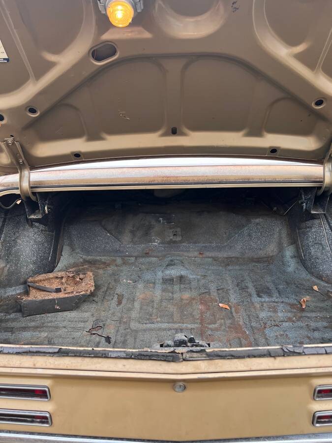 The odo reads just north of 17,000 miles, and that’s kinda-sorta represented as original, but as we know, the 1960s odos didn’t have the hundred-thousands digit, so this may be 117,000, but that should be confirmed with the current owner. The interior certainly doesn’t show as such, though the exterior is worse, as detailed below. Inside, this car is a looker. Gold upholstery and trim, a beautiful console, floor-mounted shifter, bucket seats, and woodgrain accents on the dash. Even the headliner is intact. It’s all so nice that you could have fun just sitting in this car and admiring it, even if you never get it driving. But who buys a car for that? You’ll want to take some serious time to get the under-hood items right. The seller says nothing about the usefulness of the engine, and the car is shown on a trailer, so no promises about whether it’s going to move under its own power anytime soon.