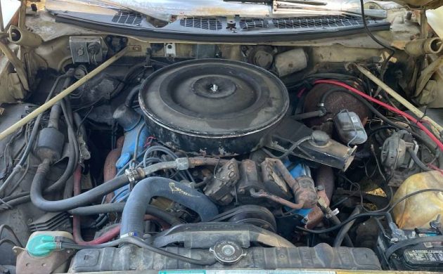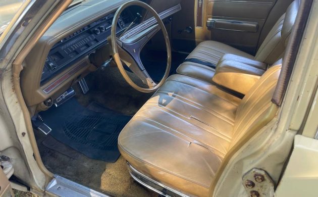 We cover big station wagons all the time, but the Chrysler Town & Country variety is among the least seen. ChryCo knocked out about 20K copies in ’73, but my guess today, a half-century later, is that they are few and far between. T&C’s were offered in a single body style/trim level. All were paneled in fine Di-Noc paneling and were available with accommodations for either six or nine passengers. Styling is always subjective, and this car’s flanks are unmistakably reminiscent of Mopar’s fuselage styling. The front end, however, is another matter, especially compared to its ’72 predecessor – I’d rate it boxy and bugly. The butterscotch hue is oh so seventies and is in fair shape, though there are places where it has chipped or peeled away. As for the “rich” faux wood paneling, it is either faded or is missing in places, but not entirely. Most importantly, the body of this bruiser appears to be solid with no indication of rot. It’s complete too, the extensive stainless trim is all still attached. As for the fender skirts, they’re a matter of preference.