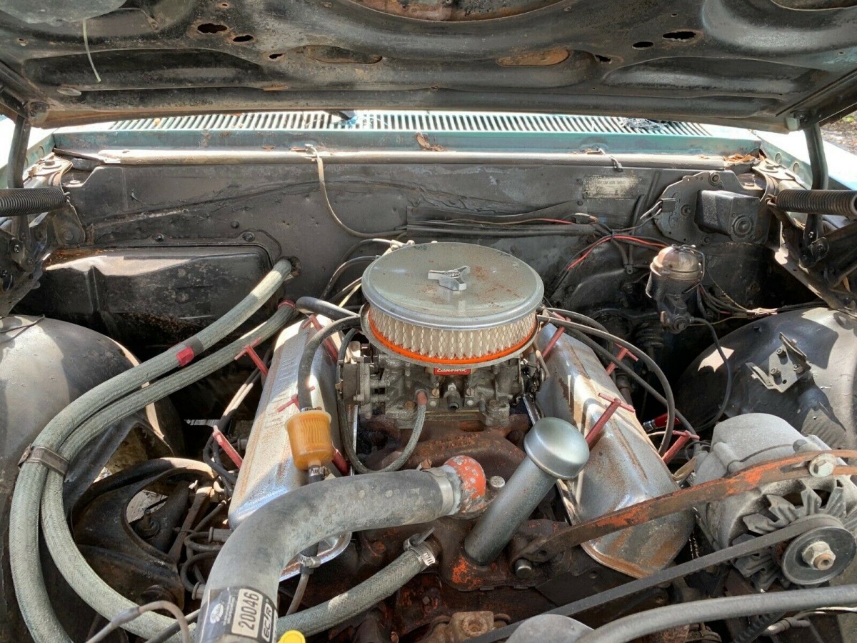 No mention of the 327 cubic inch V8 engine being brought to life is mentioned. The engine is connected to a center console-mounted four-speed manual transmission. It has a 4-bolt main with a 12-bolt rear end. It also has an aluminum radiator. They do note as well that the trunk pan needs to be replaced, along with the rear passenger quarter panel, and one trunk hinge. The undercarriage photo shows a surprisingly solid car.