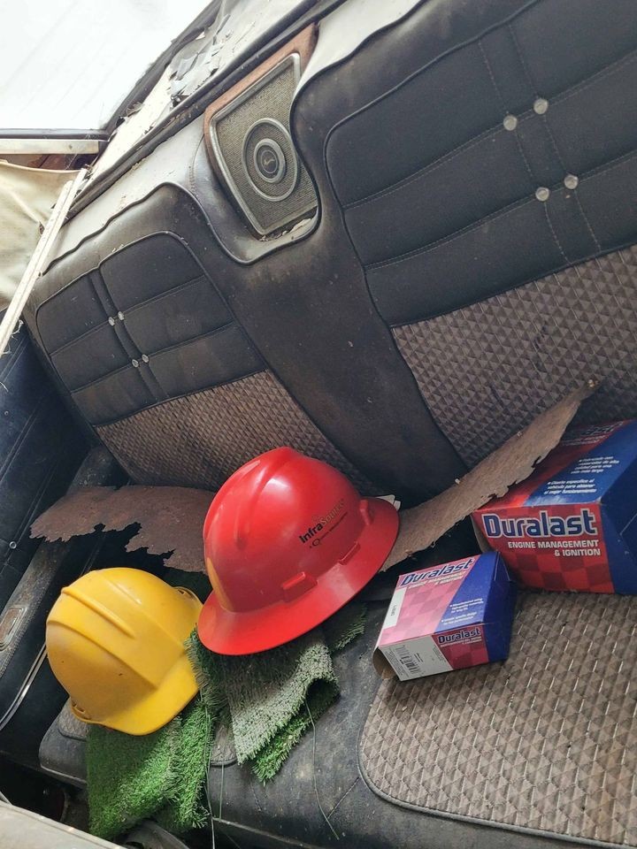 The back seat of the Impala doesn’t look too bad, although the rusty metal and Duralast parts boxes may be a little ominous. No word in the text on whether or not the hard hats are included in the sale.