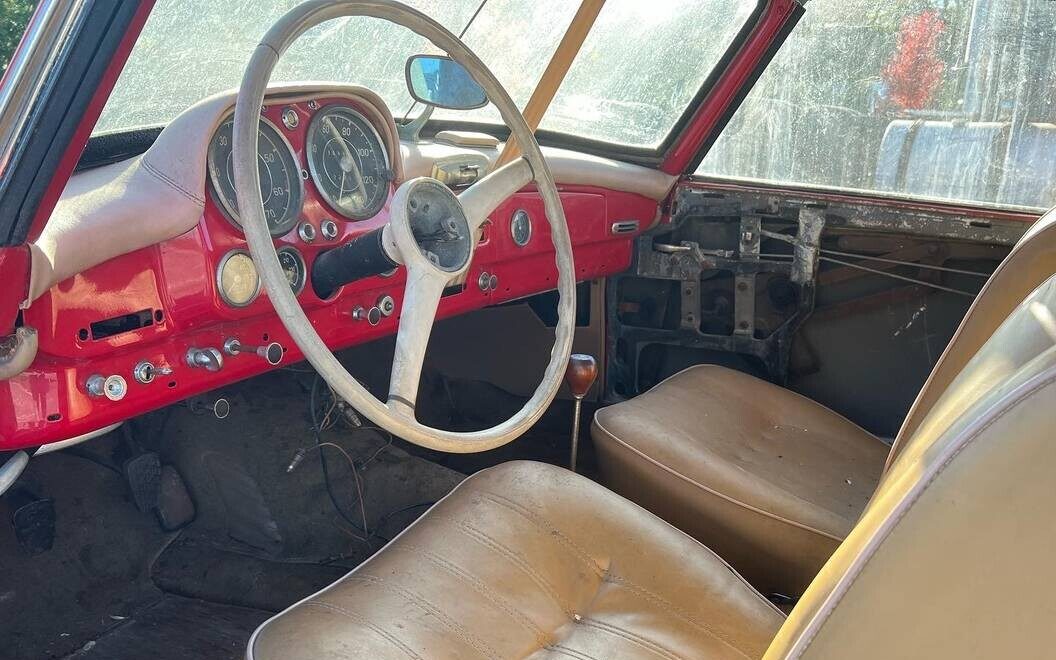 Inside is about what one would expect considering the exterior’s presentation. The bucket seat’s beige upholstery is faded but not ripped or disintegrating and the instrument panel appears to have a full complement of gauges, though the radio and some other components are missing. The steering wheel is cracked, the center horn cap is missing as are the door cards. The total environment is in fair shape but needs at least a minimal amount of attention for any kind of enjoyable motoring use.