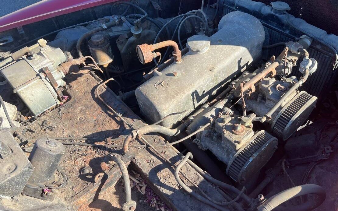 We’re told that this Benz is “fairly complete” though I know from some creative wordsmithing that “fairly” can cover a lot of width. Some trim is noted as missing but so is the rear bumper, the door handles, the driver’s door rearview mirror, and Mercedes’ distinctive wheel covers. The finish is pretty worn and just not looking too smooth – it’s hard to tell from the images if it’s the actual paint, what’s underneath it, or a little bit of both. Noted are scrapes and chipped paint with a certain lumpiness in places that could be indicative of poorly repaired rust. There are a few underside images and one, in particular, looks as if it is revealing a seam-separated floor pan. While the folding top is worn looking, it appears to still have integrity.
