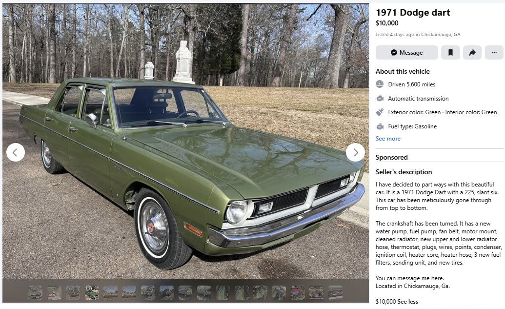 The seller lists the mileage of this 1971 Dodge Dart as being 5,600, but unless the stars have somehow aligned, there’s total political harmony, and everything is perfect in the world, I’m guessing it’s 105,600 miles. This can be found listed here on Facebook Marketplace in Chickamauga, GA, and the seller is asking $10,000. Here is the original listing, and thanks to T.J. for the tip!