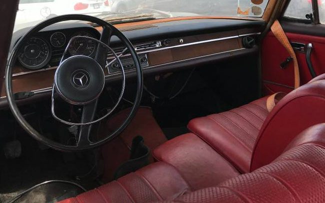 The red vinyl interior is in impressive condition for such long-term storage, and the dash appears uncracked. Door panels are also quite presentable, but it’s hard to gauge the condition of the carpets and wood veneer on the dash. The original Blaupunkt is still present and overall, we get the feeling there were plans to restore this grand old Mercedes before life got in the way. Also note the windshield stickers, which may be further signs of foreign registration or inspections.