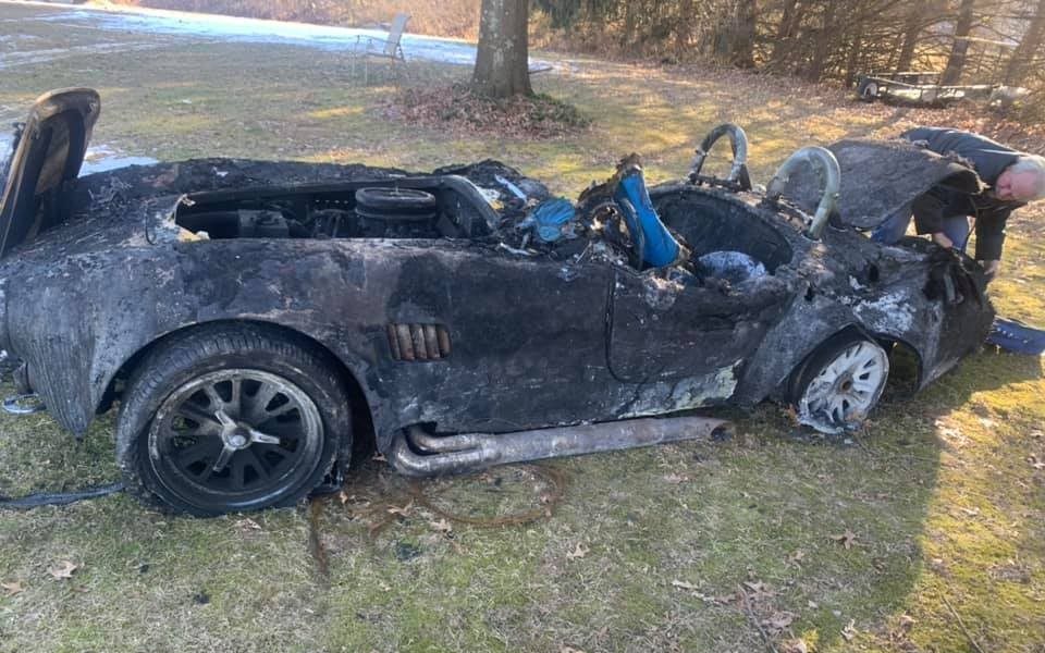 Having lost a car (not a Cobra, nor even a Cobra replica) in a fire, wherein my car looked about like this, I’ll repeat my hard-learned advice, posted here several times, over the years: WALK AWAY, WALK AWAY, WALK AWAY. Even those parts which can be removed from the car are not to be trusted. Let me ask you: If there’s enough heat to melt aluminum and glass . . . . . . . . .