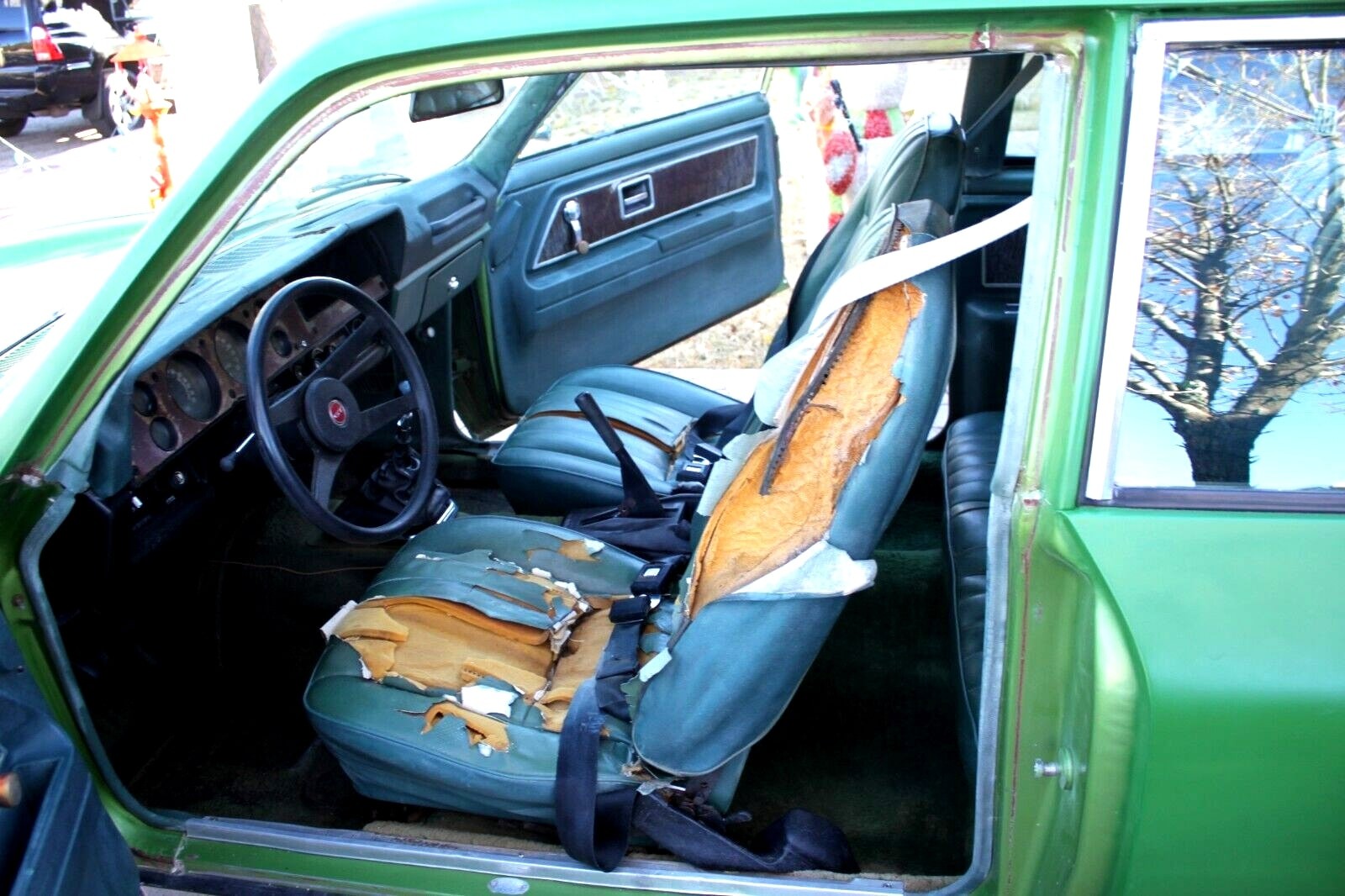 The interior appears complete and does seem to reflect the highly original claim made by the seller, with the front buckets a major eyesore but also an easy repair, or just throw a couple of seat covers over them and call it a day. The dashpad has suffered a similar fate, but from what I can tell the cluster still looks OK with the odometer showing 5,529 miles plus a hundred thousand I’m assuming, a lifespan beyond where many of these cars got to. But the metal surrounding the speedometer is showing lots of corrosion, which makes me fear that there may be even more areas where the tin worm has been nibbling that we can’t easily see.