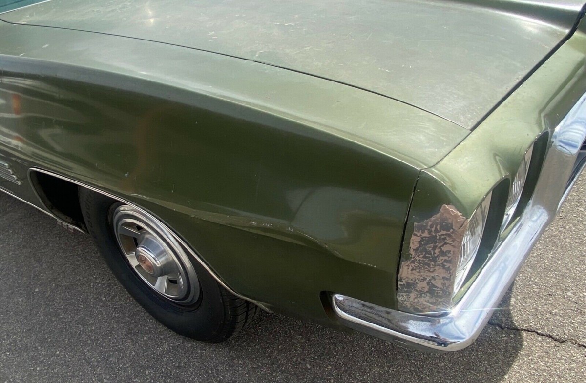 This LeMans appears to be wearing Palisade Green Metallic paint which is faded and has its share of scratches and scrapes. But rust doesn’t appear to have invaded the inner sanctum. The valance panels under the bumpers seem to need attention, but nothing major. The corner of the right front fender shows some Bondo peeking through from some earlier work that was done, but a CarFax report might help indicate if an accident was involved.